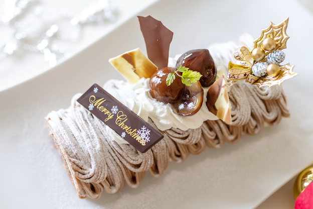 ココア生地で栗クリームと渋皮栗のミンチを優しく巻いて、たっぷりのモンブランクリームで覆いました。