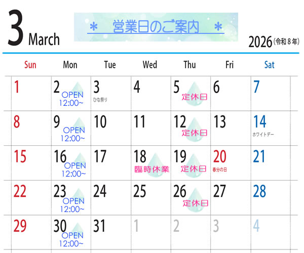 ※ 3月18日(水)は臨時休業です。